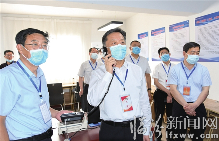閆晨曦一行首先來到市教育局高考指揮中心,看望慰問考務人員,聽取全市高考準備情況匯報,查看各縣(市、區)指揮中心實時監控畫面,與襄汾縣指揮中心進行電話連線,詳細了解考場監控、網上巡查、考試指揮等方面情況。隨后,閆晨曦深入臨汾市第一實驗中學考點、臨汾同盛中學(北同盛)考點,主動接受體溫監測后,實地檢查了解考務人員配備、監控設備運行、隔離考場設置、防疫物資儲備、醫療服務保障等情況。