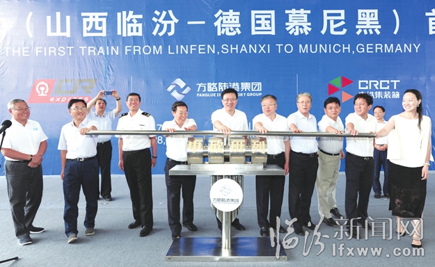 圖為省市領(lǐng)導(dǎo)共同推動“臨汾—德國慕尼黑”中歐班列開行啟動桿。記者 趙俊堂 攝
