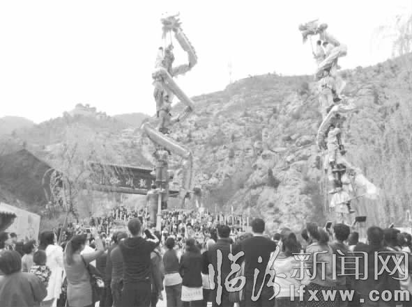 好戲輪番上演,舞龍”表演隨即登場。演員們舉竿奔走,兩條色彩絢麗的“龍”立即顯得活靈活現,時而歡騰奔躍,時而蜿蜒游走,時而幻變造型。在眾人的驚嘆聲中,演員們順桿而上,立為“人柱”,兩條“龍”盤旋而上,一條噴出火焰,一條噴出水花,名為“雙龍斗法”。這一高超的技藝,贏得陣陣掌聲。