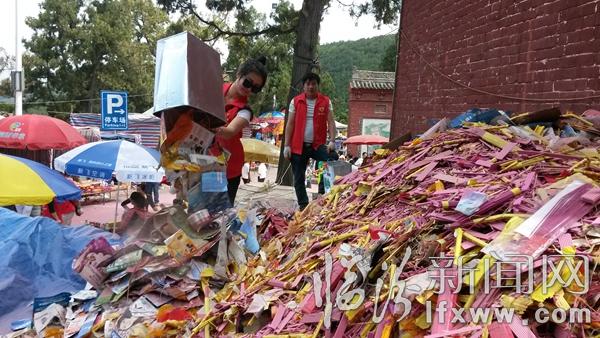 然而,每年游客們離開后,上山的道路上都會產(chǎn)生大量的垃圾。據(jù)當(dāng)?shù)亟y(tǒng)計,每年來逛廟會的游客大約有數(shù)萬人之多,這么多的人難免會產(chǎn)生很大量的廢棄物。5月16日,在當(dāng)天的古廟會上,一群身穿紅色衣服的志愿者在山上開始撿括垃圾,并開展環(huán)保宣傳引導(dǎo)游人文明旅游。