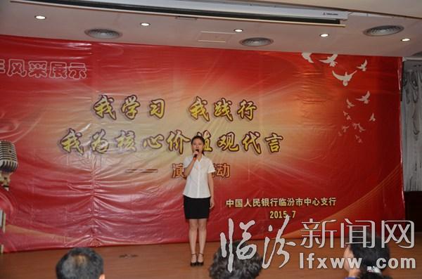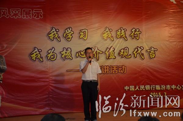 臨汾新聞網訊 在流火的七月,人行臨汾中支成功舉辦了“我為核心價值觀代言”主題演講活動。人民銀行四樓多功能會議廳,雖然室內的溫度如同臺上選手激情四溢的表演一樣炙熱,但一個個真誠友愛的故事,一段段觸動心靈的陳述,一篇篇飽含正能量的文字,像一股清涼的甘泉滋潤著心田,打動著臺下的每一位觀眾……