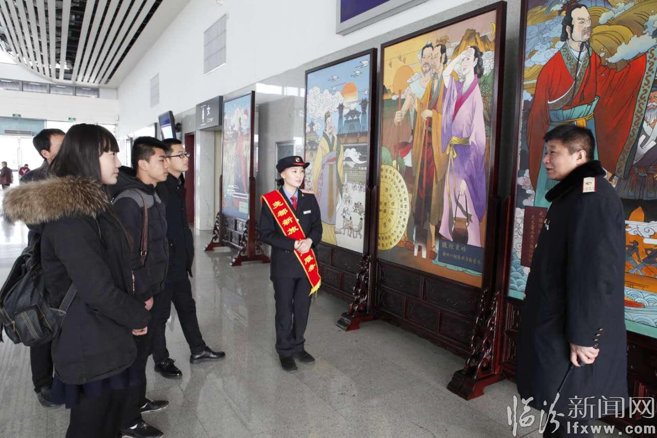 圖為臨汾西站站長和“堯都新旅”工作人員為外地來的幾位大學生講解候車室“堯文化”壁畫。