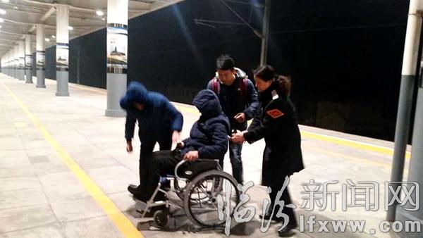 乘坐D5319次列車的旅客,原本21:34分到目的地,結果晚點至0:16分。列車到達后,客運值班員王文屏、黃霞得知5號車廂車6B號座有一位重點旅客需要輪椅服務。陪同看病的妻子、兒子不是臨汾本地人,遇到這種情況也不知如何是好!見此情況,王文屏讓黃霞將“堯都新旅“服務臺輪椅推向了5號車廂位置,因重點旅客動作緩慢,出站后最后一趟公交車載滿旅客也開走了,“怎么辦?”王文屏想了想總得幫旅客解決,讓旅客回家,隨后自己求助于老公,老公開著自己家的車一并將旅客送回目的地,家屬感激的說“今天動車雖然晚點了,但是得到了你們的貼心服務,真是太感謝了!以后出門還選擇坐動車”。