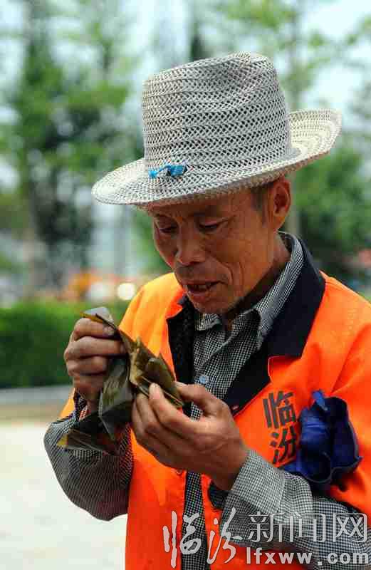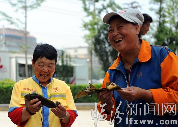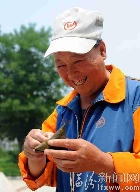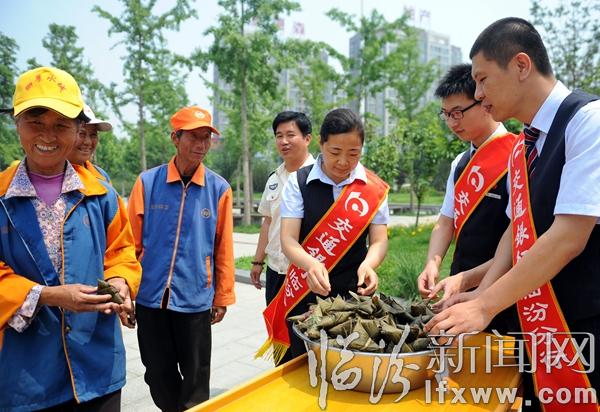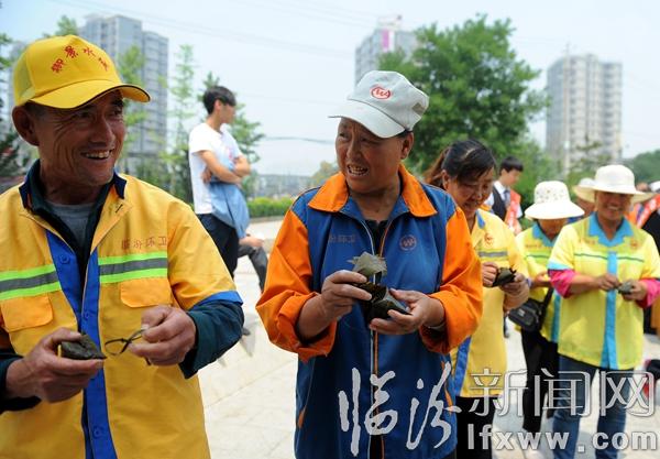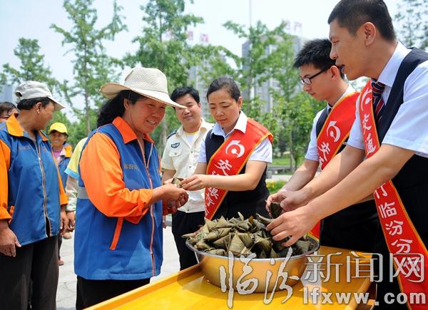 臨汾新聞網(wǎng)訊 6月8日,臨汾市環(huán)衛(wèi)局城東環(huán)衛(wèi)所的一線環(huán)衛(wèi)工人高興的收到了愛心粽子。當(dāng)日,交通銀行臨汾分行的青年志愿者們?yōu)樵撍?00余名環(huán)衛(wèi)工人送去了愛心粽子,感謝他們?yōu)槌鞘星鍧嵏冻龅呐Γ瑸樗麄兯腿ザ宋缂压?jié)的慰問和祝福。 記者 閆銳鵬 攝