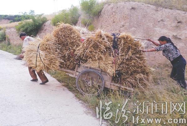 經記者了解,原來他們是父子倆,老者已有88歲,老人揮舞著鐮刀緊張忙碌。“父親叫成三喜,我叫成國新。”老人的兒子介紹,這塊地有點坡度,不適宜機械收割。最主要的是家里養了幾頭牛,手工收回的麥秸,還可以當牲畜的飼料。“父親干活不遜于我這年輕人,兩人一天能割4畝地。” 遠方的烏云擋住了夕陽,翻過山梁,陶村堡的張姓夫妻倆將收割好的麥子,滿滿地裝了一平車,丈夫前邊拉,妻子后邊推。“孩子遠在深圳打工,幾畝坡地的麥子,我倆用不了幾天就能收完。”記者 王隰斌