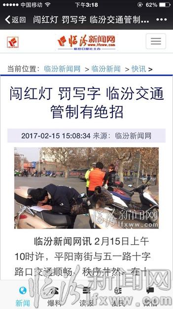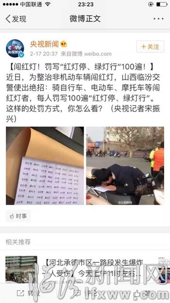 臨汾新聞網(wǎng)訊(記者 高秀云) 2月15日,記者采寫(xiě)了《闖紅燈 罰寫(xiě)字 臨汾交通整治有絕招》的新聞,短短幾天時(shí)間,這則新聞被全國(guó)各大媒體大量轉(zhuǎn)發(fā)、報(bào)道,網(wǎng)友參與熱情極為高漲,截至2月19日下午18時(shí)30分,央視新聞微博的瀏覽量已經(jīng)達(dá)到1432萬(wàn),轉(zhuǎn)發(fā)3836次,評(píng)論7745條,點(diǎn)贊4萬(wàn)。人民日?qǐng)?bào)微博的閱讀數(shù)259萬(wàn),轉(zhuǎn)發(fā)1102 次,評(píng)論1730 條,點(diǎn)贊8141。