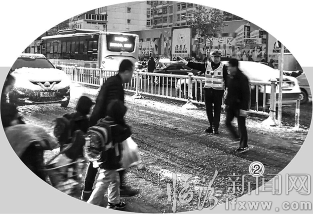 1月4日早7時,市交警支隊南城交警大隊五一路學校護學崗的民警正在學校門口護送學生過馬路。