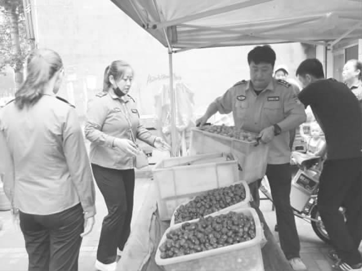 這些商鋪位于解放路與二中路十字口的東南角,商戶們一大早就將蔬菜、水果、魚、肉等物品搬到店外銷售。市容監(jiān)察支隊(duì)路東中隊(duì)負(fù)責(zé)商戶貨物進(jìn)店鋪的工作,經(jīng)過工作人員的勸說和解釋,得到了全部商戶的理解。在搬運(yùn)貨物中,30名工作人員也加入其中,很快就將店外貨物全部搬入店鋪。