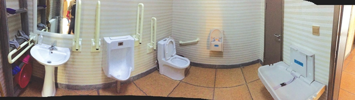 衛生間內設有坐便和無障礙扶手,也有供兒童使用的坐便器和降低高度的洗手臺,還包括母親為嬰兒換尿布使用的大隔板等設施,室內地面、墻面鋪設了瓷磚,環境干凈整潔。
