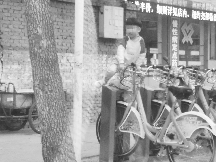 時間:5月6日18時30分地點:南洪家樓中段臨汾長途電信線務局對面不文明行為:孩童攀爬公共自行車停車樁
