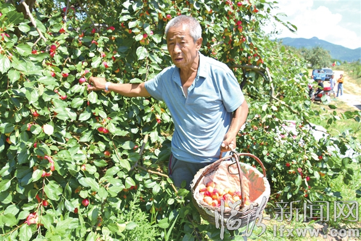 今年,隰縣陡坡鄉辛莊村1000余畝海棠果成熟情況好,家家戶戶海棠果色澤粉紅鮮亮誘人,果肉香甜可口,海棠果產量高于去年,村委和駐村工作隊舉辦采摘節,極大地促進了農民增收。圖為李有繩在自家海棠果園為游客采摘海棠果。
