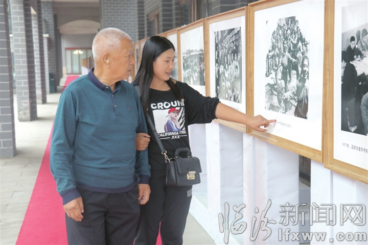 10月4日,華門新天地文旅藝術館走廊,78歲的劉進富在女兒劉麗萍的陪伴下參觀臨汾市攝影圖片展。