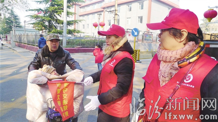 為了讓人們聽清自己的聲音,李文英特意摘掉口罩,一遍遍地重復著“走路不要看手機,注意安全”“同志,不能逆行”“不要著急,慢點兒騎”……幾番下來,她的臉凍得通紅,嗓子也喊啞了。即便如此,她的工作熱情絲毫不打折扣。