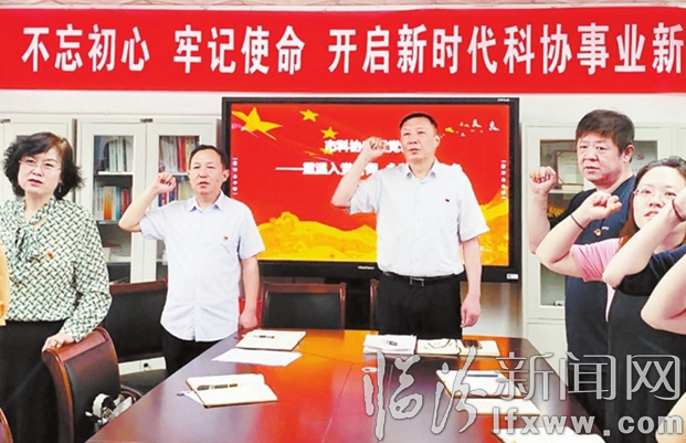 市科協黨組書記郭迎明(右三)在“七一”主題黨日活動中,與全體黨員重溫入黨誓詞。