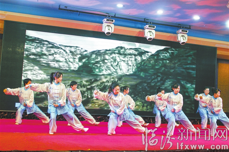 臨汾新聞網訊 12月20日,臨汾市陳式太極拳研究會舉辦2020年年會,我市廣大太極拳拳友及臨汾武術協會、健身氣功協會等體育健身愛好者齊聚一堂,表演了精彩的文藝節目。圖為9名太極拳愛好者正在進行太極表演。