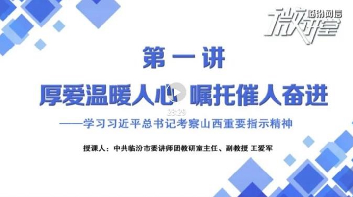 授課人:喬富萍,現任臨汾市委講師團理研室主任。作為市委宣講團成員,多年來,一直從事理論政策研究及宣講,曾多次講授公開課。撰寫的《三個為什么解讀中國成功密碼》被評為全省優秀理論宣講報告。