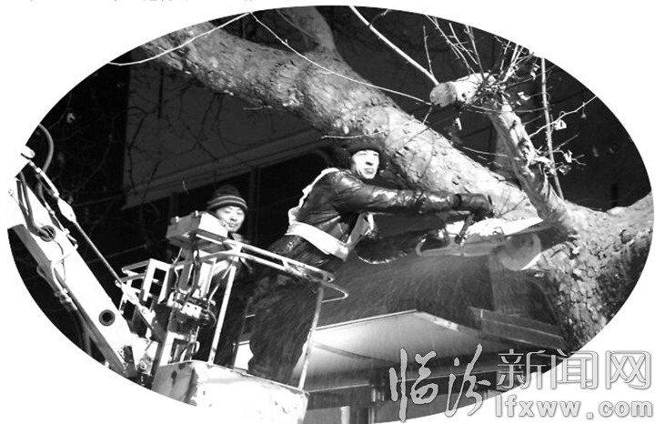 臨汾新聞網(wǎng)訊 2月1日晚11點(diǎn),市綠化一隊(duì)的園林工人們頂著寒風(fēng),對(duì)解放路兩邊的行道樹(shù)進(jìn)行修剪。