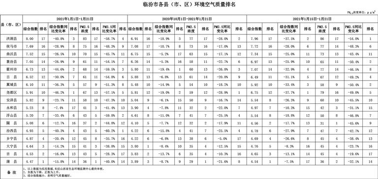 1、以上數據為實況數據,未經山西省生態環境監測中心最終審核。 2、負數為下降,正數為上升。 3、綜合指數越小,表明空氣質量越好。