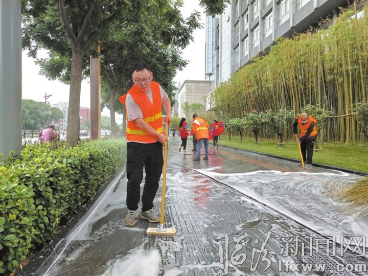 志愿者與環(huán)衛(wèi)工人共同清洗向陽(yáng)西路