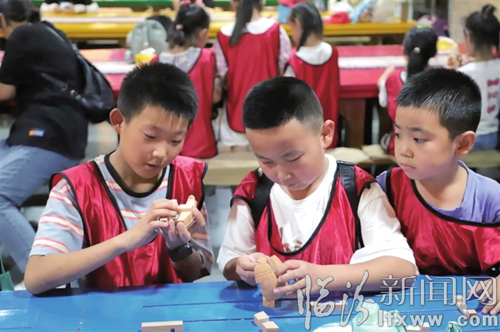 “孔明鎖,也叫八卦鎖、魯班鎖,相傳是三國時期諸葛孔明發(fā)明的一種玩具……”同學(xué)們正在認(rèn)真聽老師介紹魯班鎖。11歲的龐鈺琪就眨巴著眼睛問道:“那它為啥叫孔明鎖呢?”老師立即將問題拋給大家:“你們說說這是為什么?”“這是一把聰明鎖。”……老師高興地說:“對,孔明鎖就是聰明鎖。它是中國古代傳統(tǒng)的土木建筑固定結(jié)合器。不用釘子和繩子,完全靠自身結(jié)構(gòu)就能連接支撐,很神奇,這充分反映出我國古人的聰明才智。”在老師的指導(dǎo)下,同學(xué)們開始邊琢磨邊拼搭孔明鎖,現(xiàn)場氣氛十分熱烈,不一會兒,有人搭成了井字鎖,有人搭成了三通鎖,還有人搭成了難度系數(shù)較高的菠蘿鎖……