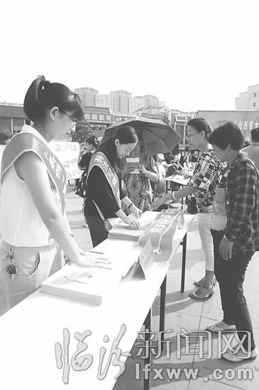 臨汾新聞網(wǎng)訊 (記者 潘華玲)近日,由臨汾市總工會(huì)主辦的《山西省女職工勞動(dòng)保護(hù)條例》宣傳月啟動(dòng)儀式暨大型咨詢(xún)?nèi)栈顒?dòng)在鼓樓廣場(chǎng)舉行。此次活動(dòng)以擺放宣傳展板、發(fā)放宣傳資料和免費(fèi)義診的方式進(jìn)行,現(xiàn)場(chǎng)工作人員對(duì)于市民提出的問(wèn)題進(jìn)行了耐心解答。