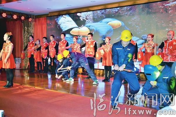 “過年過節不間斷、隨時待命把活干;毫不懈怠樹典型、燃燒青春鑄輝煌……目標明確思路清、鼓足干勁不能松;堅定信心永向前,拭目以待一七年。”搶修員、巡檢員、調壓員們穿上喜慶的服裝,踏著明快的節奏,用一場精彩的音樂劇《臨燃風采》將整臺文藝匯演推向高潮。音樂劇中,職工們用鏗鏘的腳步、振奮的話語,記錄了臨燃人在服務城市燃氣供應中躊躇滿志、努力開拓的印跡,留下了臨燃人腳踏實地、兢兢業業的足跡,更展示了他們不忘初心、繼續前行的十足干勁。
