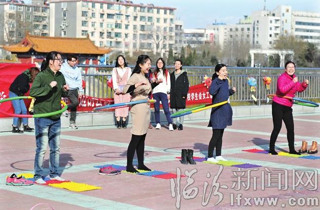 臨汾新聞網訊 3月7日,山西師范大學美術學院的女教師們正在參加趣味運動會。當日,該學院舉行了“健康每一天,做幸福女人”主題趣味運動會,慶祝自己的節日。