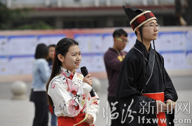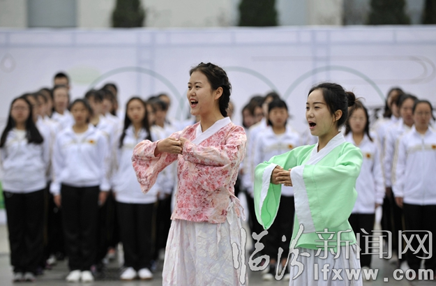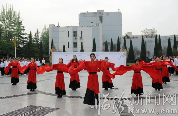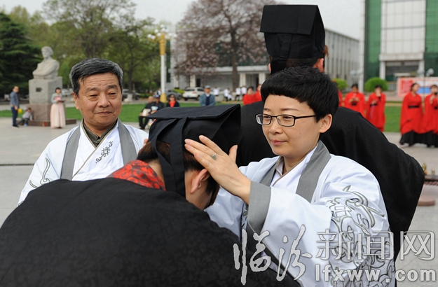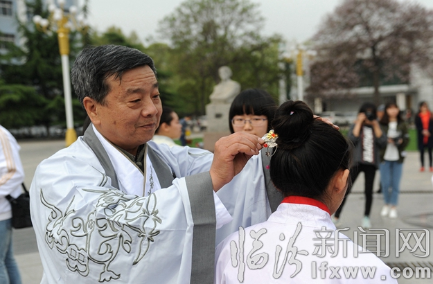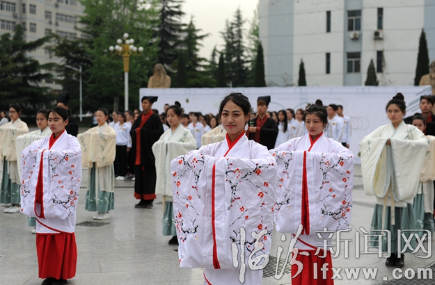 臨汾新聞網訊 2017年4月15日,在山西師范大學巨人廣場,朝歌漢服社的社團成員在進行漢服禮儀表演。當日,由山西師范大學美術學院主辦、美術學院朝歌漢服社承辦的以“筓冠成人,筑夢青春”為主題的中華傳統漢服成人禮活動舉辦,通過展現男冠女笄的中華傳統成人禮,使廣大學生認識中國傳統文化的內涵,提升個人綜合素養,領略古代禮儀魅力,將傳統文化與現代精神有機結合,激勵大學生培養“仁義禮智信”的良好美德。