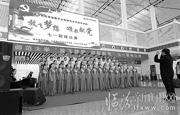 臨汾新聞網(wǎng)訊 6月30日,臨汾民航機(jī)場(chǎng)攜手山西師大音樂學(xué)院舉辦了“放飛夢(mèng)想,頌歌獻(xiàn)黨”慶祝建黨96周年歌詠比賽活動(dòng)。各參賽隊(duì)緊扣“七一”主題,用深情激昂、富有感召力的聲音,激發(fā)了大家對(duì)黨的感激和崇尚之情。