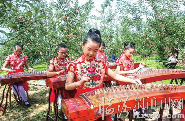 臨汾新聞網訊 近日,在吉縣東城鄉第二屆蘋果采摘節上,該縣中學生在演奏古箏。委婉動聽的曲調在社堤村果園上空回蕩,優美箏音令游人陶醉,上演了一場美妙的視聽盛宴。