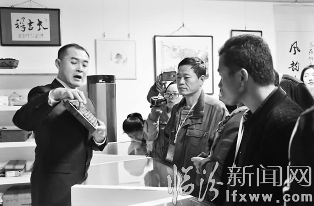 圖為市收藏家協會秘書長薛鋼正在向收藏愛好者介紹他收藏的黃花梨算盤。記者 孫宗林 攝影報道