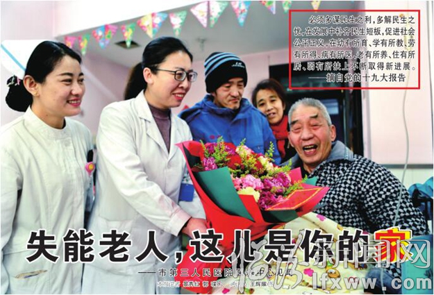 從醫(yī)養(yǎng)中心出來,記者走進(jìn)了院長刁士琦的辦公室。“黨的十九大報告提出實施健康中國戰(zhàn)略,積極應(yīng)對人口老齡化,構(gòu)建養(yǎng)老、孝老、敬老政策體系和社會環(huán)境,推進(jìn)醫(yī)養(yǎng)結(jié)合,加快老齡事業(yè)和產(chǎn)業(yè)發(fā)展。我們的醫(yī)養(yǎng)中心正是為貫徹落實這一政策而推出的,使老年人老有所養(yǎng),老有所醫(yī),為老人解除病痛,減輕兒女負(fù)擔(dān)。下一步,我們將繼續(xù)在愛心、細(xì)心、耐心、孝心上下工夫,把關(guān)愛老人的服務(wù)理念詮釋得更精準(zhǔn),讓更多的失能老人因此受益,讓家屬放心。”他的聲音分外爽朗,讓人看到了醫(yī)養(yǎng)中心的美好明天。(壓題照為醫(yī)護(hù)人員為患者祝賀生日)
