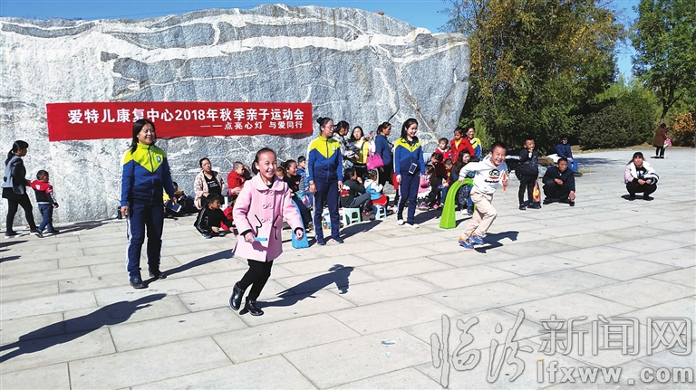 康復(fù)訓(xùn)練(2)班和康復(fù)訓(xùn)練(3)班孩子們的比賽項目是“袋鼠跳”和“寶寶接力賽”,指導(dǎo)老師告訴家長,“袋鼠跳”是訓(xùn)練孩子們的手腳協(xié)調(diào)能力,“寶寶接力賽”是訓(xùn)練孩子們的團結(jié)合作能力。在陽光下,孩子們歡樂的笑聲和燦爛的笑容,讓記者忘記了他們是一群“孤獨癥”智障兒童。