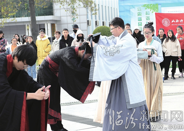 臨汾新聞網訊 11月24日,山西師范大學美術學院“朝歌漢服社”在該校巨人廣場舉行了以“向青春致敬、為夢想起航”為主題的成人禮活動,通過“禮儀之邦”舞蹈表演、“金蛇狂舞”琵琶演奏、“風動草”陶笛演奏及現場成人禮儀式,使大學生領略古代儀禮的魅力。