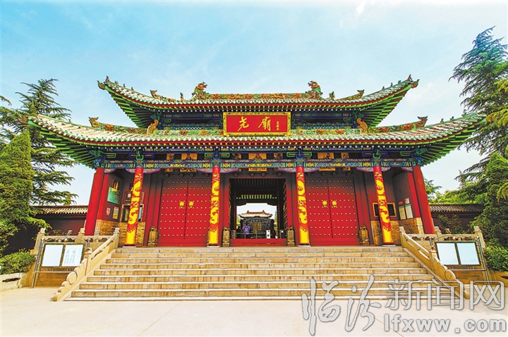 沿著“龍鳳之脈”主線繼續向北,一座威嚴的古建筑廣運殿矗立眼前,分立兩旁的對聯“居平陽倚河汾深植民族之根、啟文明定中華垂譽國家先祖”訴說著它深厚的文化底蘊。