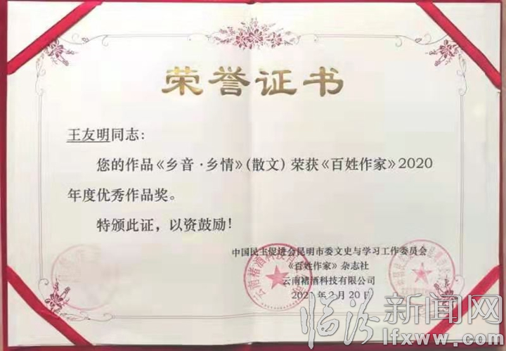 這次年度優秀作品評選,是由中國民主促進會昆明市委文史與學習工作委員會、《百姓作家》雜志社、云南褚酒科技有限公司聯合主辦的。王友明的散文作品《鄉音鄉情》,將客居異鄉半個多世紀,深切思念故鄉、懷想親人的一腔真情,流于筆端、躍然紙上,令人讀后,抵達肺腑,感懷不已,觸碰著靈魂深處最柔軟的一隅。這切實的真摯情感,獨有的命題特質,透徹的心靈觀照,凝練的文筆特色,富有著濃郁的鄉土生活氣息。這是一篇抒寫故鄉之情的美文,更是一篇弘揚家國情懷的佳作。