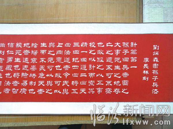 近幾年他刻出的書法作品,主要有毛澤東的《沁園春·雪》《長征》《北戴河·大浪淘沙》。傳統書法經典有:《蘭亭序》《九成宮》《千字文》《弟子規》《朱子家訓》《岳陽樓記》《洛神賦》。去年從秋到冬用了5個多月的時間,刻出了由書法大師劉冰森書寫的、長達6000多字的《孫子兵法》,30多米的書法長卷獨領風騷,受到書法愛好者和書法家們的好評。山西著名書法家趙國柱先生點贊:“長林刻紙,意蘊無窮?!绷硪晃恢麜翼n左軍為李長林題詞:鏤月裁云。