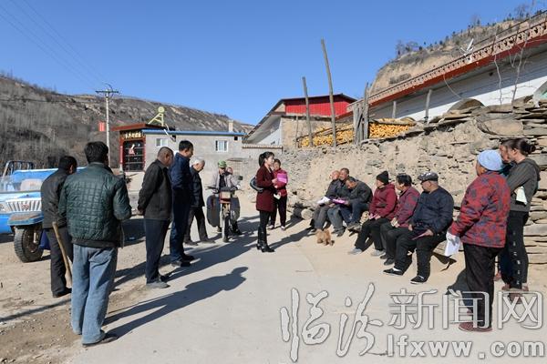 永和縣委組織部副部長(zhǎng)、坡頭鄉(xiāng)岔口村第一書記曹曉卉進(jìn)村入戶向群眾宣傳講解精準(zhǔn)扶貧政策