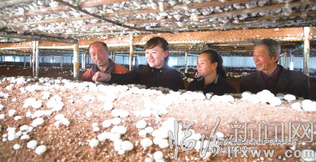 圖為董敏向種植戶(hù)詢(xún)問(wèn)雙孢菇生長(zhǎng)及銷(xiāo)售情況
