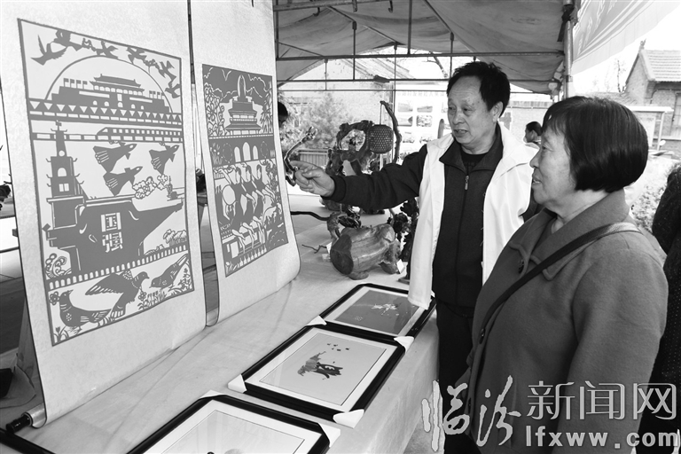 喬金錄給游客介紹自己新創作的剪紙作品《中國夢》。(衛琦 攝)