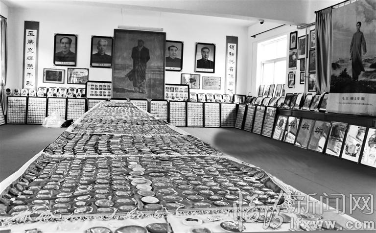 推門而入,眼前的景象是宏大和不可思議的。在由會議室改造的偌大展廳里,四壁掛滿了各種式樣的領袖畫像,倚墻而立的是近百面繪有花卉、寫有語錄的鏡子,條桌上擺滿了各種材質、不同造型的偉人塑像,居中的展臺上則整齊碼放著各式毛主席像章,足足綿延二三十米……