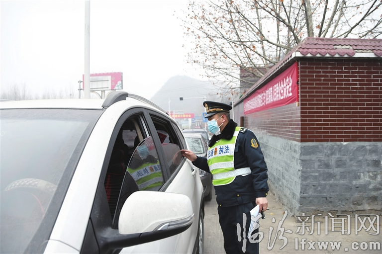 在岳陽鎮偏澗村國道341入境口,工作人員正在測量體溫、 登記備案。