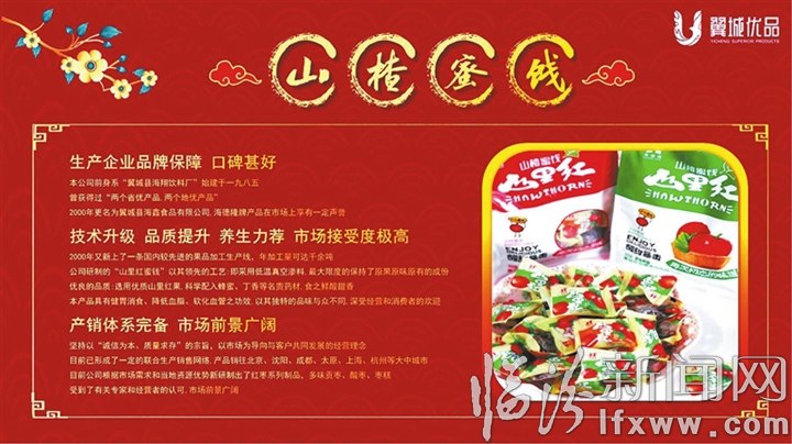 山楂蜜餞選用優質山里紅果,科學配以蜂蜜、丁香等名貴藥材,食之鮮酸甜香,具有健胃消食、降低血脂、軟化血管等功效,翼城海鑫食品有限公司采用國內先進果品加工生產線,每年加工生產“山里紅蜜餞”千余噸,以低溫真空滲料技術,最大限度保持原果原味原有成分,符合大眾口味,市場前景廣闊。