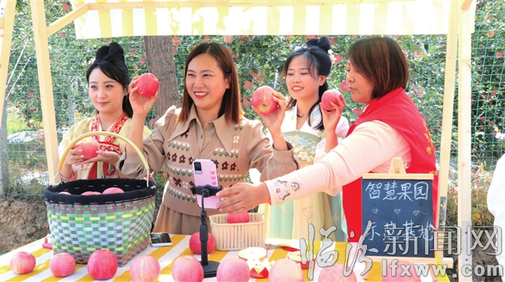 在人聲鼎沸的采摘園里,累累碩果綴滿枝頭,輕風拂過,淡淡果香沁人心脾。果樹下,年輕媽媽剛剛摘下一顆嬌艷欲滴的果子,身旁蹣跚學步的頑童便抱著啃起來,汁水從嘴角流了出來。樹影間,貌美的模特一襲漢服衣袂飄飄,攝影師們頻頻摁動快門留住一個個美好瞬間。最為活躍的要數來自蒲縣文旅特產鄉村e鎮的網絡達人們,她們面對手機鏡頭侃侃而談,進行著直播帶貨……紅撲撲的蘋果映紅了每一個人的笑臉。
