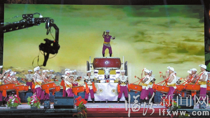 一束追光刺破黑暗打在舞臺中央的巨鼓上,一聲沉雷般的鼓點傳出,數十面大鼓同時震顫,鼓手們騰挪跳躍,鼓點密如驟雨——演出在《雄鼓開天》的鑼鼓表演中拉開帷幕。