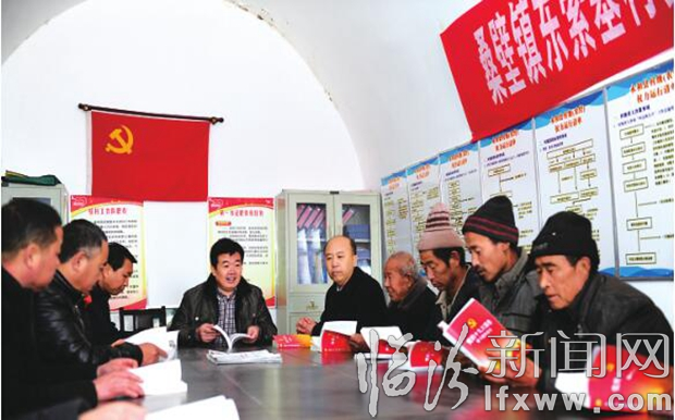 圖為農行臨汾分行黨委書記、行長李繼勝為東索基村黨員干部解讀十九大報告。