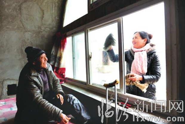 圖為農行志愿者杜愛親給殘疾人徐三喜收拾家務。