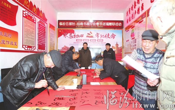 臨汾新聞網訊 1月15日,臨汾日報社駐村扶貧工作隊邀請汾西書畫協會汾南分會8位農民書法家到團柏鄉柴洼莊村為村民書寫春聯。書法家們展紙揮毫潑墨,用一副副寄寓著美好愿景的春聯為村民送去祝福。