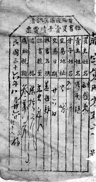 根據該票內容反映出,買主是劉俊義,賣主為徐天繼,牙子叫王虎。用現代語言來說,牙子”這個稱謂就是牲畜 交易員,至今在呂梁山一帶集市上對牲畜交易員仍稱呼為“牙子”,也有“牙漢”之稱。這張稅票告訴我們,劉俊義于1947年8月26日在公峪村買了一頭黑母驢,價格60元,“應納稅額”為3元,經手人是一楊姓人。