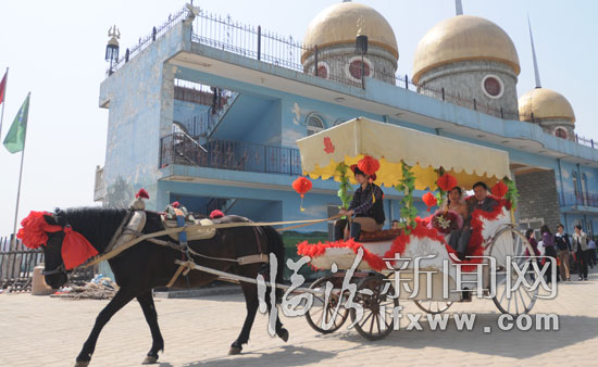 臨汾新聞網(wǎng)訊 5月1日,一對(duì)新人坐馬車在怡乎貝爾草原牧場(chǎng)舉行婚禮。時(shí)下簡(jiǎn)潔浪漫低碳環(huán)保婚禮成了時(shí)尚。(記者 李虎威 攝)